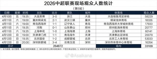 直播吧4月13日讯 2026赛季中超联赛第五轮战罢,据《转会市场》中国区管理员朱艺统计,本轮中超现场观众总人数264872人,排名中超历史单轮现场观众总人数第3位。