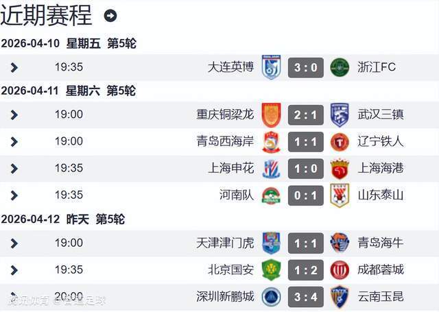 中超第5轮的8场比赛已经全部战罢,具体战况如下:大连英博3-0浙江、重庆铜梁龙2-1武汉三镇、青岛西海岸1-1辽宁铁人、上海申花1-0上海海港、河南0-1山东泰山、天津津门虎1-1青岛海牛、北京国安1-2成都蓉城、深圳新鹏城3-4云南玉昆。