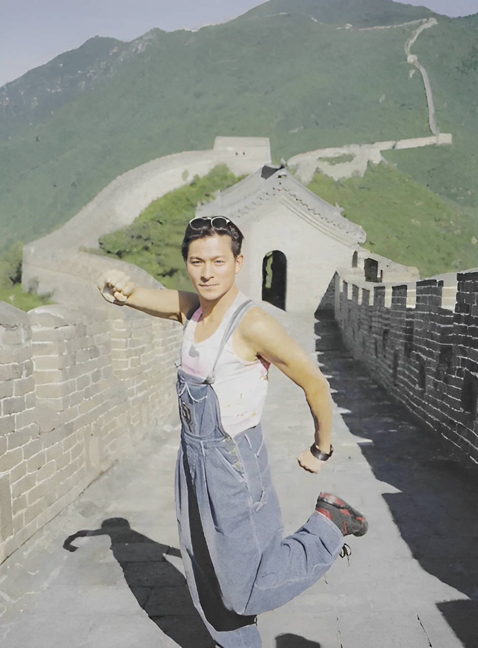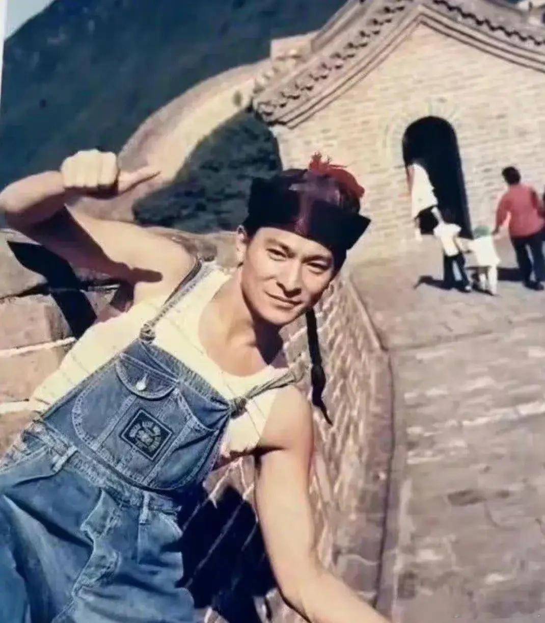 更劲爆的是1997年,刘德华在拍摄《中国人》MV间隙,于长城上玩出新花样。他脱掉背带裤背带,意外露出粉红色肚兜,各种卖萌姿势尽显青春朝气,当天的他心情大好,笑容灿烂到让粉丝尖叫。